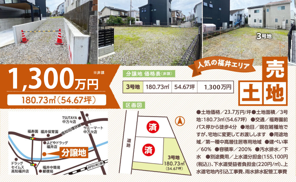 FOR SALE 香美市香北町下野尻 フォレストヴィレッジかほく(全19区画)4,855,800円~5,782,700円(非課)令和5年7月工事完了。新分譲地好評分譲中! 総区画数19区画今回販売区画数:13区画今回販売価格4,855,800円~5,782,700円地目宅地・都市計画区域外道路6m幅アスファルト舗装上水道分担金380,000円(区画)下水道分担金350,000円(区画)交通(市営)釈迦堂前バス停徒歩6分 NEW 高知福井町(1区画)分譲地(建築条件なし)1300万円(非課) 土地価格 23.7万円/坪 土地面積 3号地:180.73㎡[54.67坪] 交通 福寿園前バス停から徒歩4分 地目 現在雑種地ですが、宅地に変更してお渡しします 用途地域 第一種中高層住居専用地域 建蔽率 60% 容積率 200% 汚水排水 下水 別途費用 上水道分担金(155,100円(税込))、下水道受益者負担金(220円/㎡)、上水道宅地内引込工事費、雨水排水配管工事費 NEW 高知市神田(全2区画)分譲地(建築条件なし)1573.78万円~1786.40万円(非課) 土地価格B:28万円/坪土地面積B:210.91㎡[63.80坪]交通船岡南団地バス停から徒歩7分地目宅地用途地域第一種中高層住居専用地域建蔽率B:70%容積率B:200%汚水排水合併処理浄化槽別途費用上水道外線工事費が必要 販売中 南国市大埇乙(1区画)分譲地(建築条件なし) 1522.32万円(非課) Point! 静かな住宅地/ 1号地 209.70㎡(63.43坪)15,223,200円 土地価格24万円/坪(非課)土地面積209.70㎡[63.43坪]交通後免町電停約2㎞地目宅地用途地域市街化調整区域建蔽率60%容積率200%汚水排水浄化槽開発許可番号2南都第75号別途費用上下水道宅地内引込工事費 360,000円(税込)上水道分担金 88,000円(税込) map